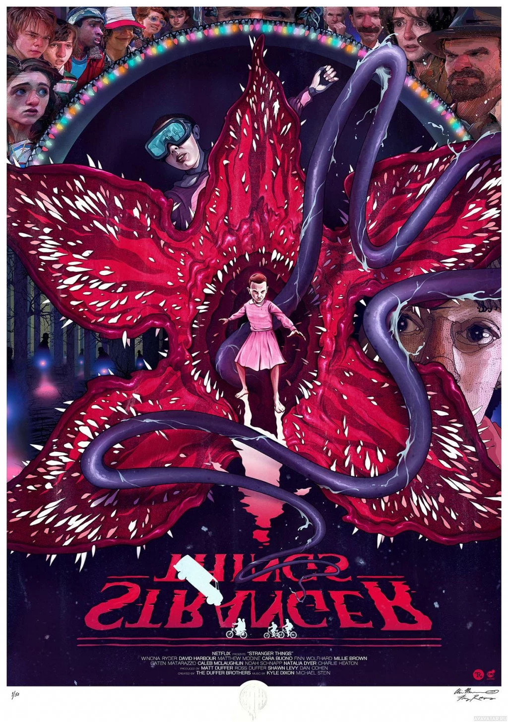 a movie poster for "Stranger Things," which is a popular Netflix series. The poster features various characters from the show, with one