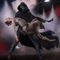 Kylo Ren, who is part of the First Order and has been depicted as a powerful force user. They are both positioned on a platform or stage, and there appears to be a backdrop featuring what looks like a spaceship interior or