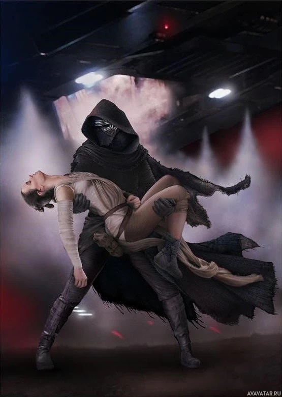 the Star Wars movie series. On the left, there is a woman dressed in brown robes and holding a staff, which resembles Rey, a character known for her role as a resistance fighter against