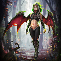 The image depicts a fantasy-themed character that resembles a succubus. She has wings, is wearing a skin-tight bodysuit, and her overall appearance suggests she may be part of
