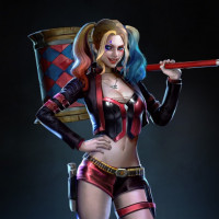 blonde hair with blue highlights, wears fingerless gloves, and has a mallet that typically signifies her association with the Joker. The character is posed confidently, holding the mallet over one shoulder.