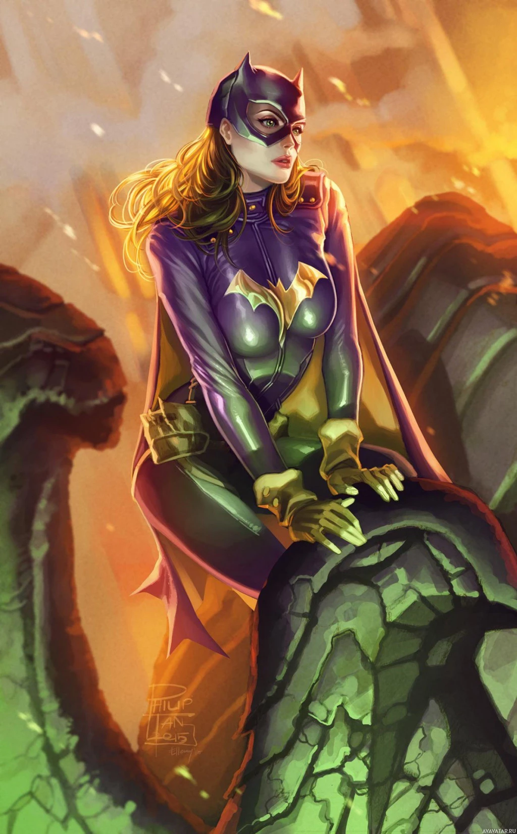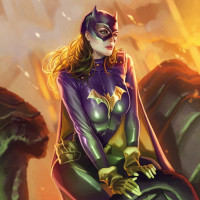 blonde hair, is wearing a black and purple costume that resembles Batgirl's iconic outfit from the comics. The background suggests an intense