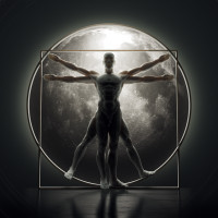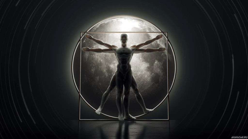 a circular frame that appears to be a representation of the moon. The individual is positioned as if they are reaching out towards or interacting with the moon's surface, which seems to have