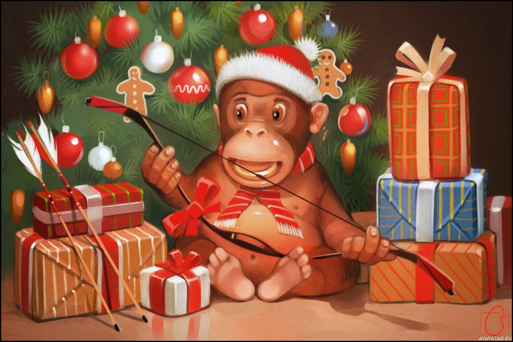 The image shows a monkey with a Santa hat on, sitting in front of a decorated