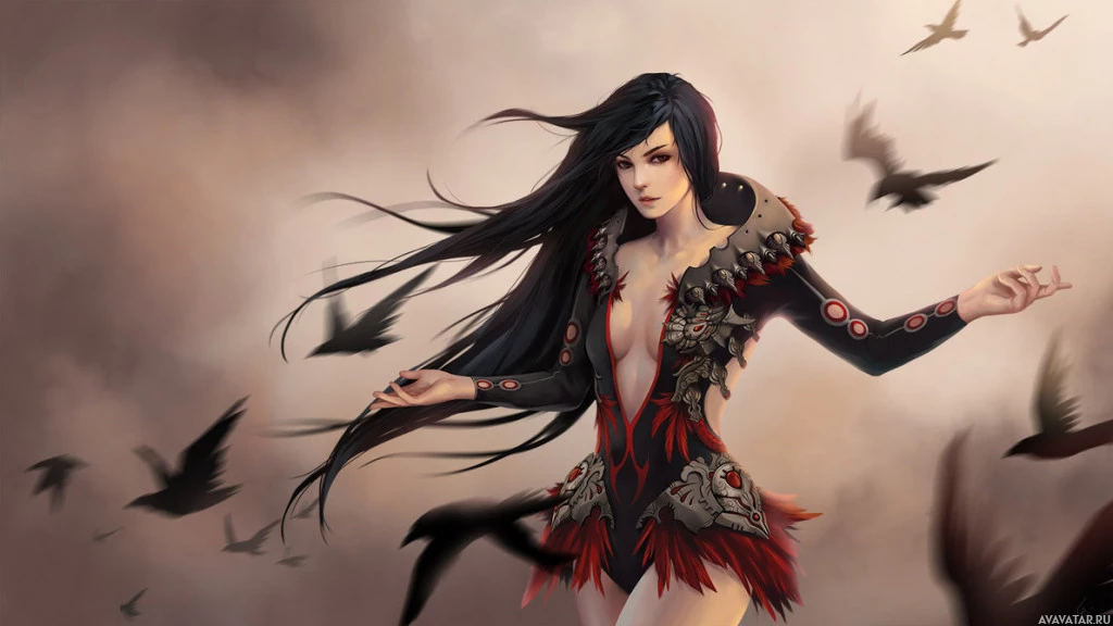 a young woman with long, dark hair and pointed ears that might suggest she is an elf or similar mythical race. She has intricate tribal-like clothing and armor, including what looks like feathers or frills at the wrists and waist. There are birds flying around her head, suggesting a connection to nature or perhaps being in some sort of