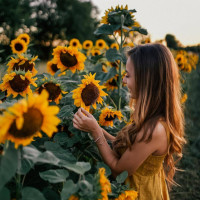 the vibrant color of the flowers around her. There are many large sunflowers in various