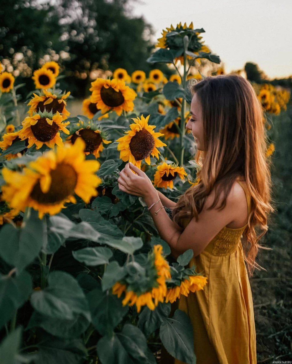a young woman leaning over to touch and smell the sunflowers. She is wearing a yellow dress, which complements
