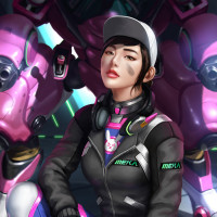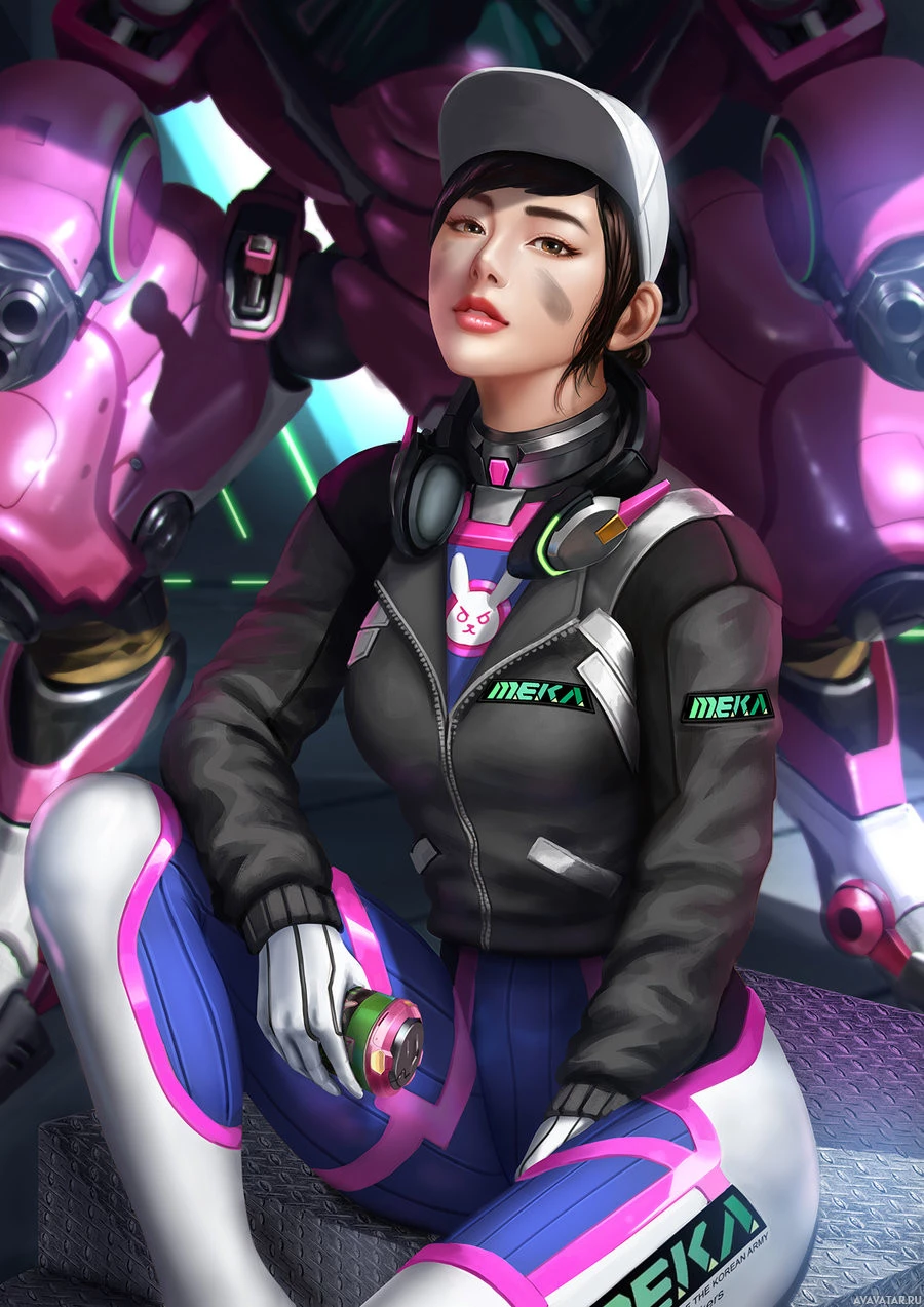 a dynamic pose, wearing her signature futuristic armor with pink accents and a cap. Her