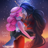a red shirt with a white collar and has a large spike on top of her head. She is Marceline the Vampire Queen from "Adventure Time." The characters are depicted in a romantic embrace, which suggests they have feelings for each other. The background consists of a starry sky and what seems to be a forest or jungle setting with twinkling lights that resemble stars. The overall tone of the image is whimsical and fantastical, fitting the style of "Adventure Time."
