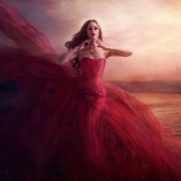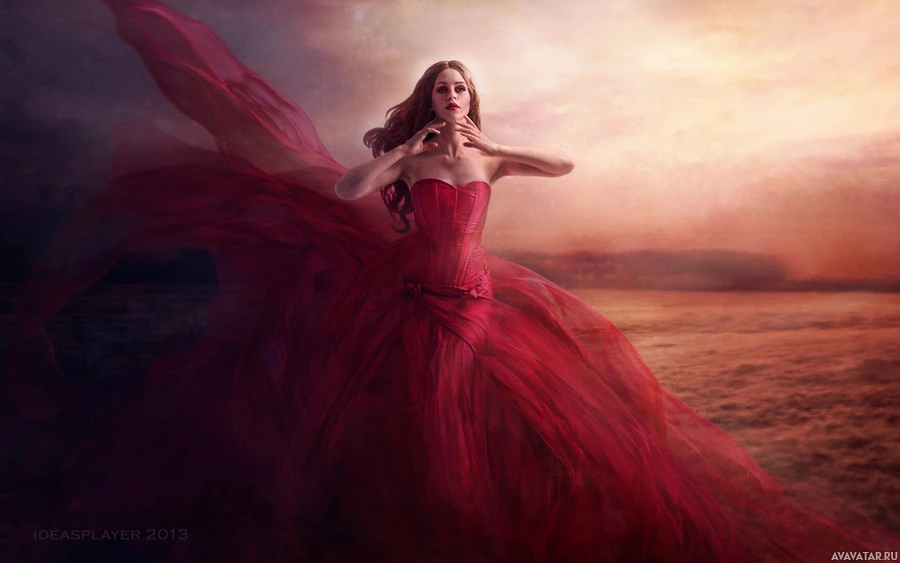 The image features a girl in an elegant red dress, with flowing fabric that suggests motion. She is standing amidst a desert-like environment with a warm, golden sky, which adds to the dramatic effect of her attire.