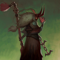 a fantasy character, depicted as a demonic creature. The character has horns and a menacing expression, with