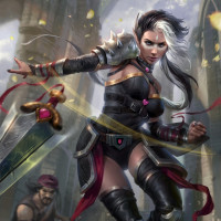 a serious expression on her face. There are also additional characters visible in the background, but they are not
