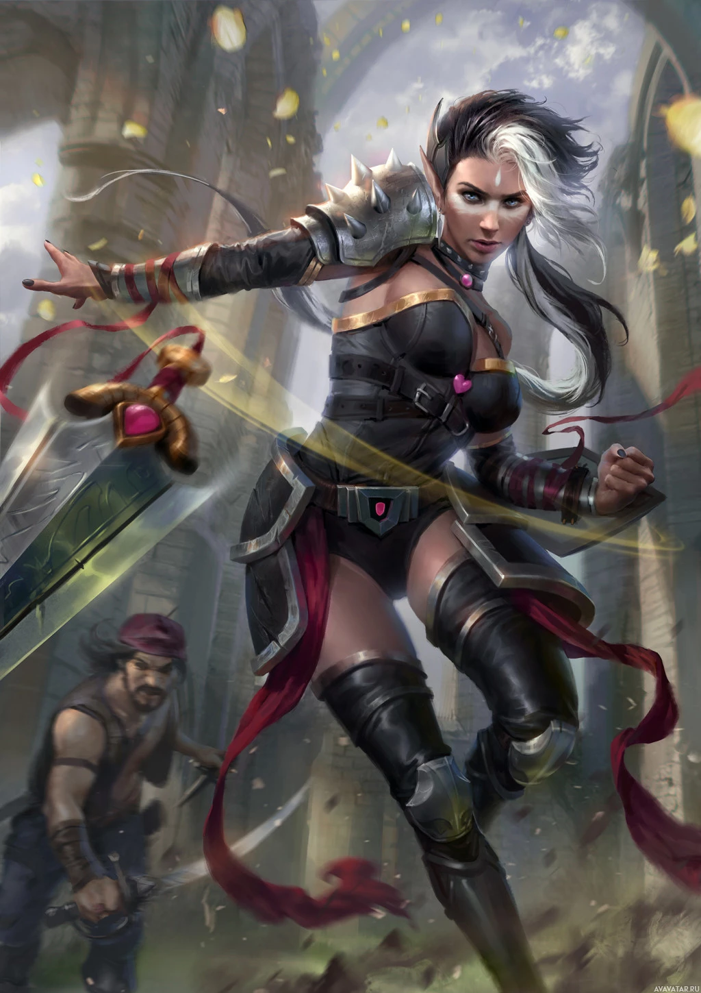 The image depicts a fantasy-themed character who appears to be an elf. She is wielding a sword in one hand and a bow in the other, suggesting she might be a warrior or adventurer. Her attire includes armor, leather accents, and she has