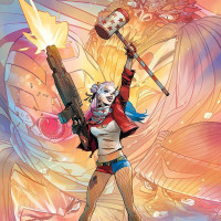 Harley Quinn, a popular comic book villainess from the Batman series. She is shown holding what looks like a mallet in one hand and a pistol in the other. Behind her, there's