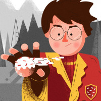 a red jacket with a golden G on it, which represents the Hogwarts School house of Gryffindor. He has