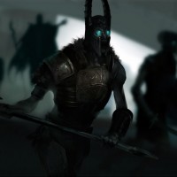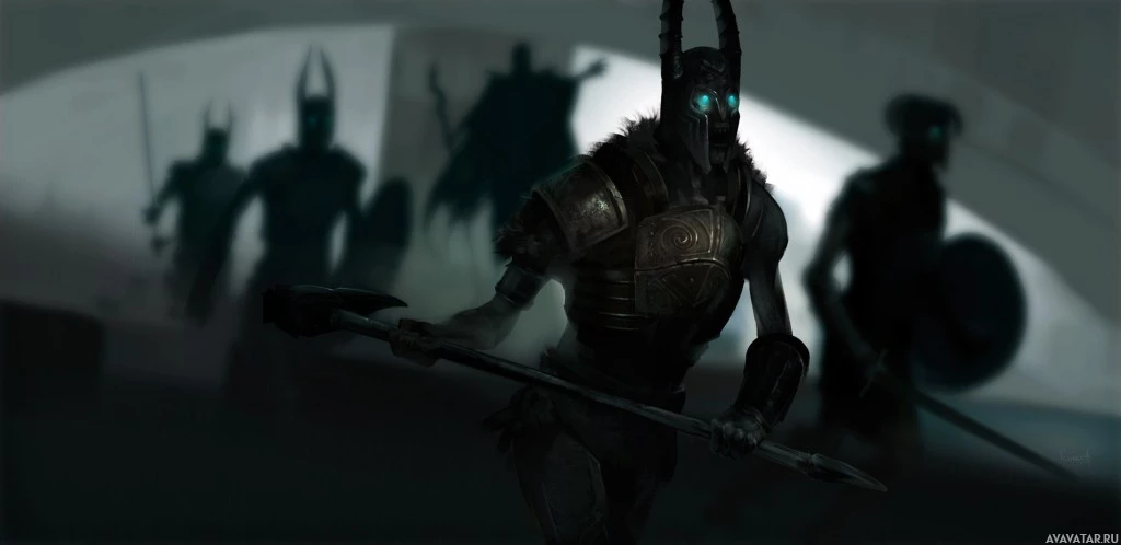 The image appears to be a stylized artwork or concept illustration for "The Elder Scrolls" series, which is known for its fantasy and role-playing game elements. In the picture, there are multiple characters that seem to be warriors or adventurers, standing in what looks like