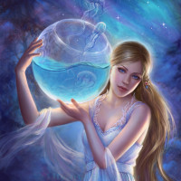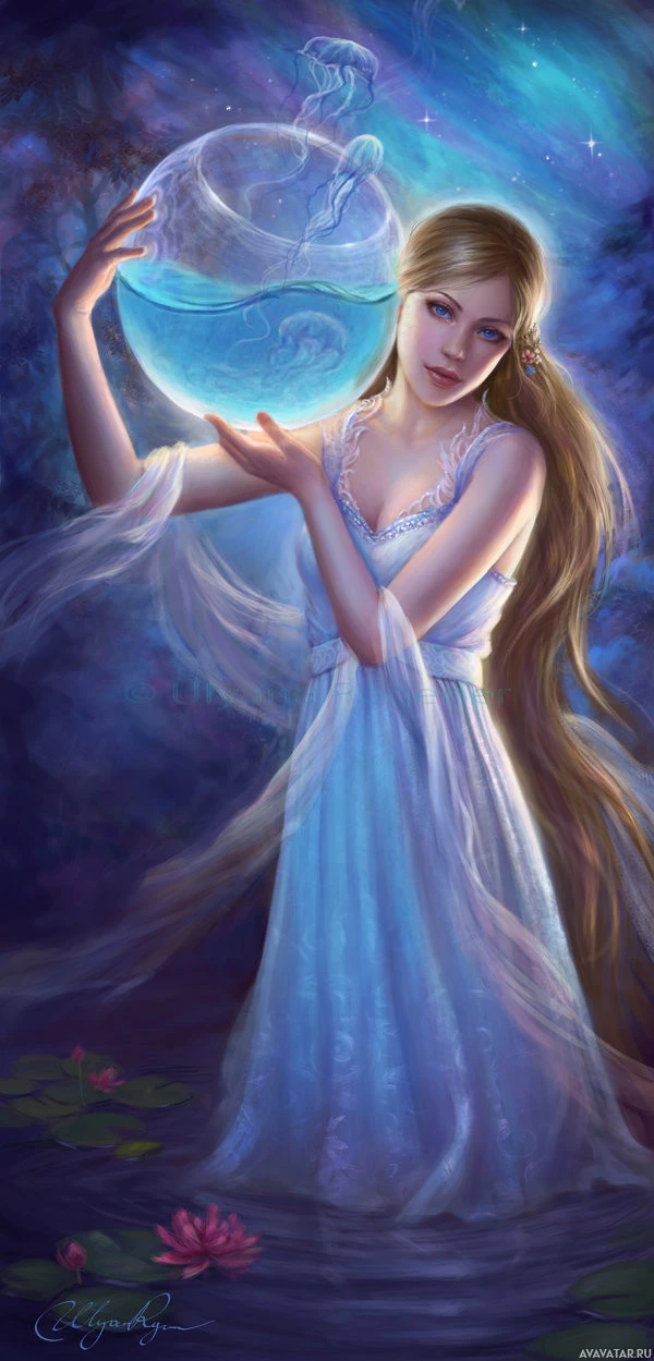 flowing dress that suggests a celestial or ethereal nature. In her hands, she holds a large aquatic globe, possibly representing a planet or moon in