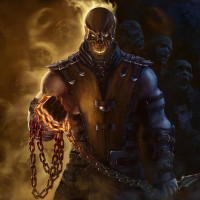 dramatic lighting and shadows, emphasizing the intensity of Scorpion's character.