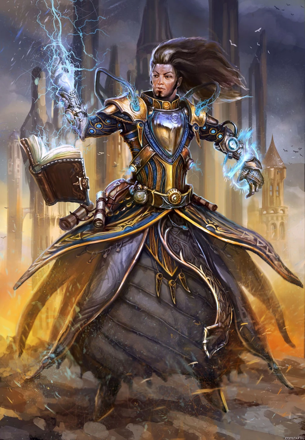The image features a fantasy-themed illustration of a character who appears to be a mage or sorcerer. This person is standing in the foreground and is holding a large, open book that seems to be emitting