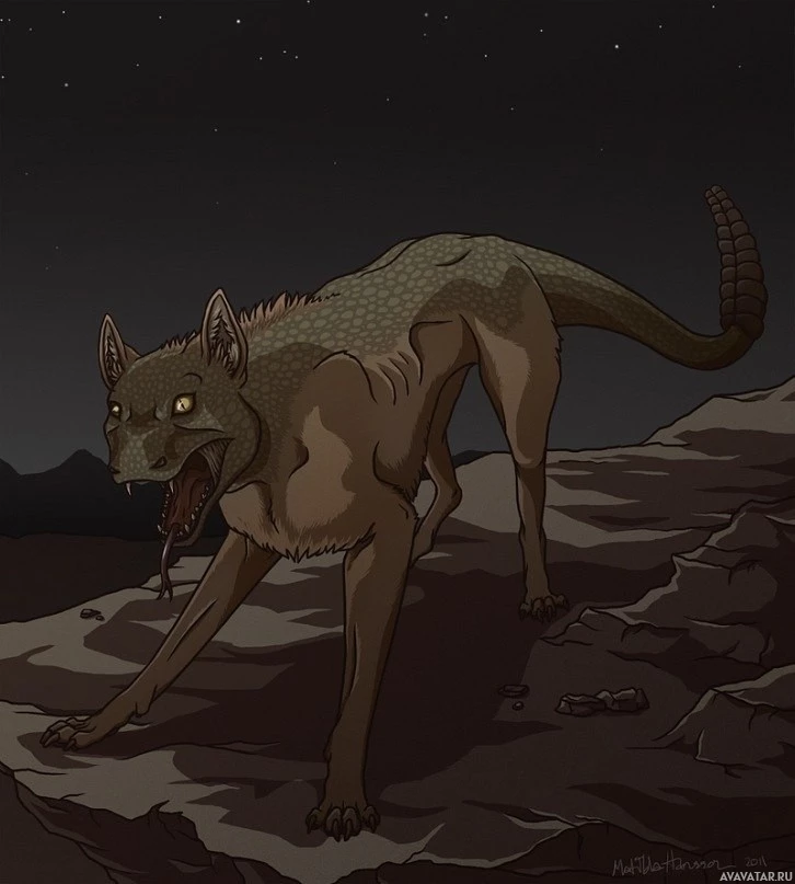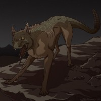 animated character that resembles a hyena or a similar wild canine. It is set against