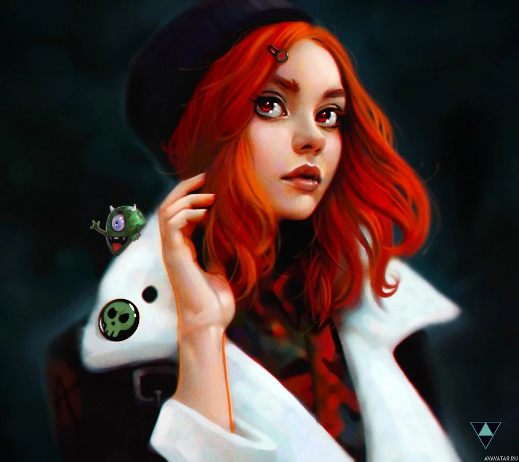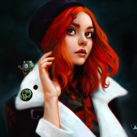 a young woman with red hair, set against what appears to be a dark background. She is wearing a coat with fur around the hood and has a button pinned to her coat that resembles an alien or