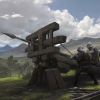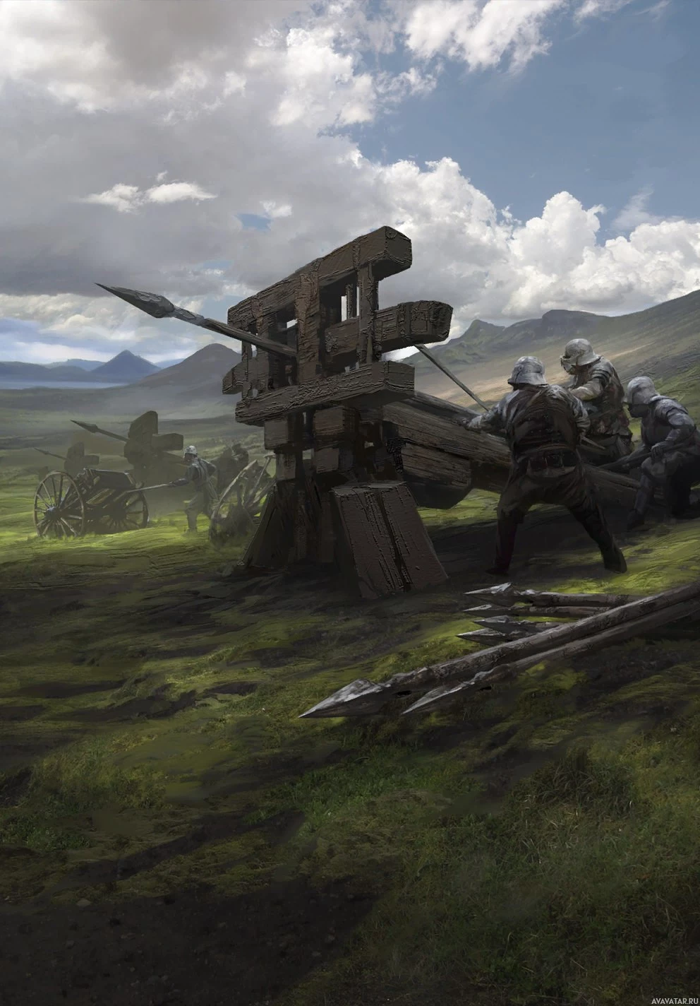 wooden structure in the foreground that appears to be part of a fortification or defensive barrier. In the background, there is