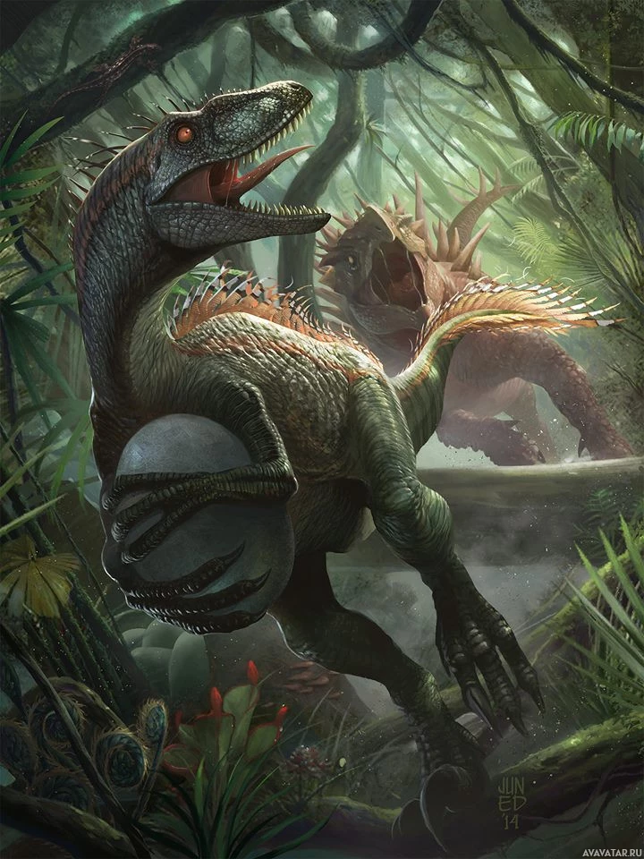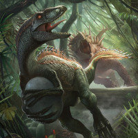 an open mouth with a visible snout. On the right side, there's another dinosaur that appears to be a Velociraptor or a similar species from the Jurassic period, known for their