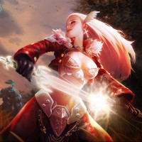 The image depicts a fantasy scene featuring a character wielding a sword. This character appears to be female and is dressed in armor, suggesting she might be a warrior or a knight. She is striking a pose that conveys confidence and readiness for battle. The background shows an environment that looks like it could be part of a fantasy setting with other figures in the distance, which further emphasizes the fantastical nature of the scene.