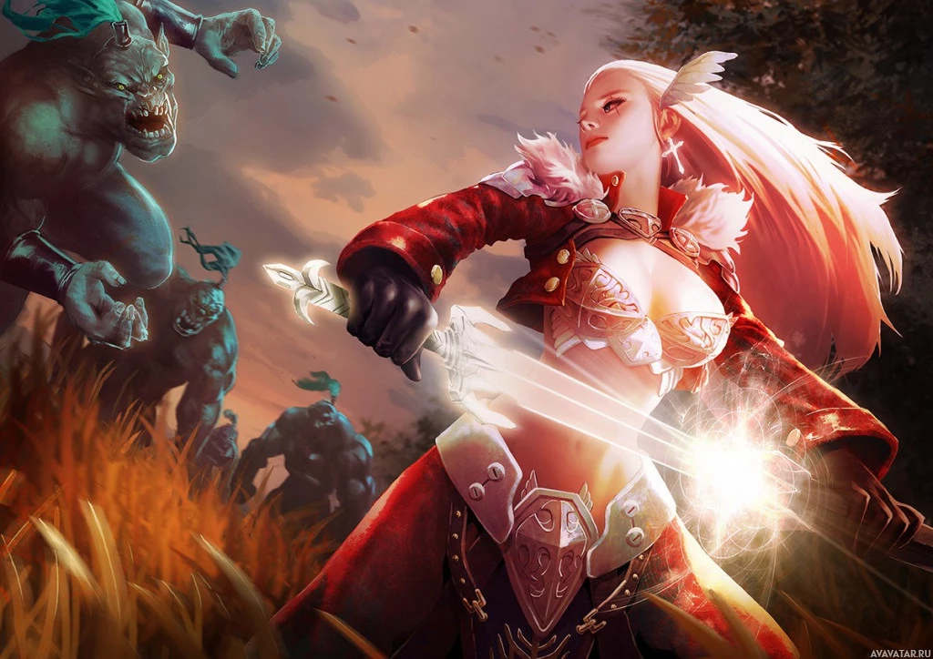 На картинке изображена сцена фэнтези с персонажем, владеющим мечом. Этот персонаж выглядит как женщина и одет в доспехи, предполагая, что она может быть воином или рыцарем. Она наносит удар по позе, которая передает уверенность и готовность к бою. Фон показывает среду, которая выглядит так, как будто это может быть частью фантастической обстановки с другими фигурами на расстоянии, что еще больше подчеркивает фантастическую природу сцены.
