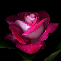На картинке изображена одна роза с нежными розовыми лепестками и небольшим зеленым стеблем. Он расположен на черном фоне, что делает розу заметно выделяющейся. Роза обрамлена некоторыми листьями, что добавляет ей природной красоты.