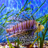 vibrant colors and elongated body. It is swimming in an aquarium with visible water plants that suggest it might be a reef tank setup designed to mimic