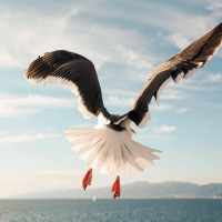 The image shows a seagull flying in the air with its wings spread wide. The bird appears to be gliding or soaring near the water, possibly over an ocean landscape. Seagulls are commonly associated with coastal environments and are known for their ability to fly long distances while using thermal wind currents.