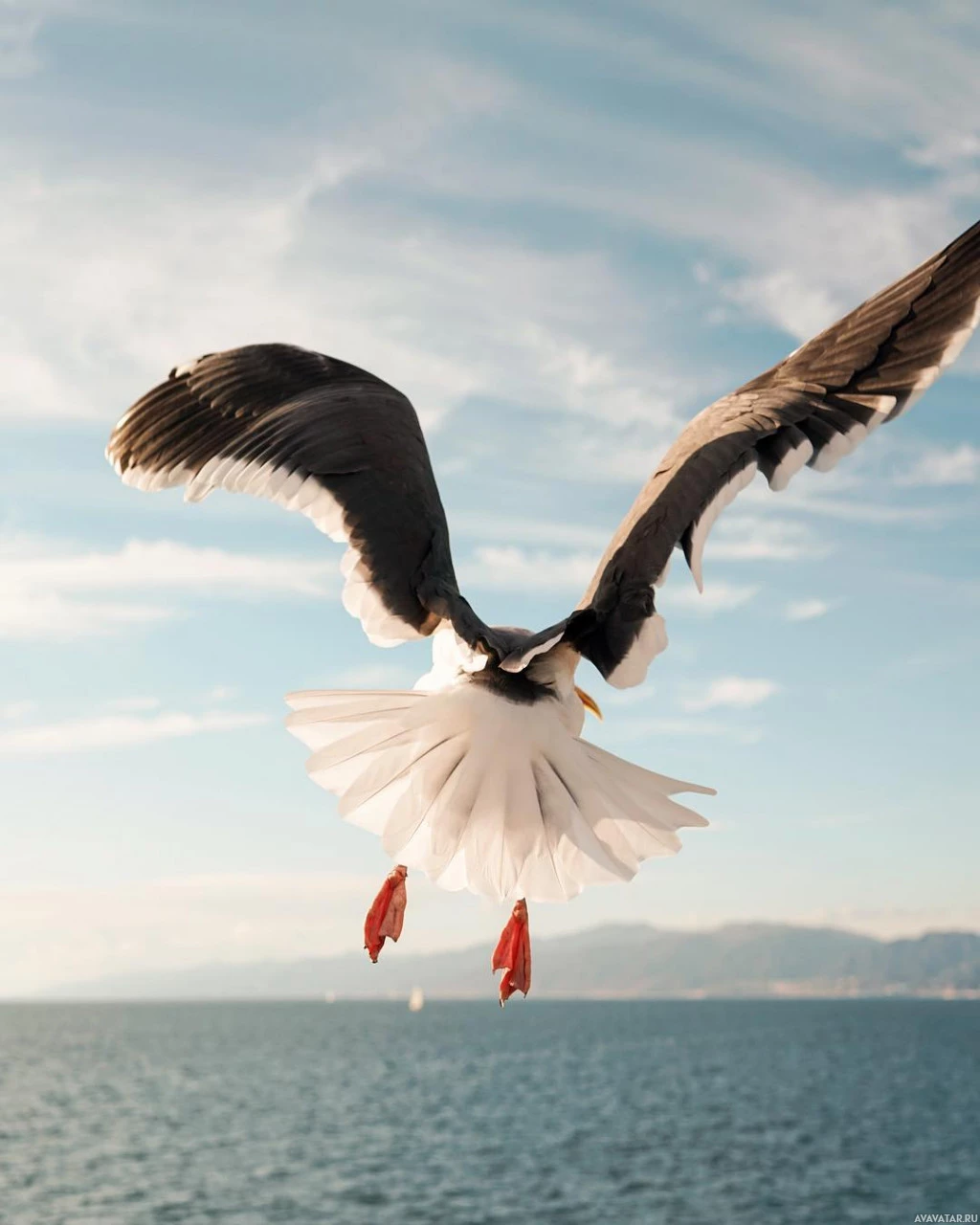 На снимке изображена чайка, летящая в воздухе с широко расставленными крыльями. Птица, кажется, скользит или парит возле воды, возможно, над океанским ландшафтом. Чайки обычно связаны с прибрежной средой и известны своей способностью летать на большие расстояния при использовании тепловых ветровых течений.