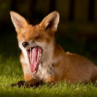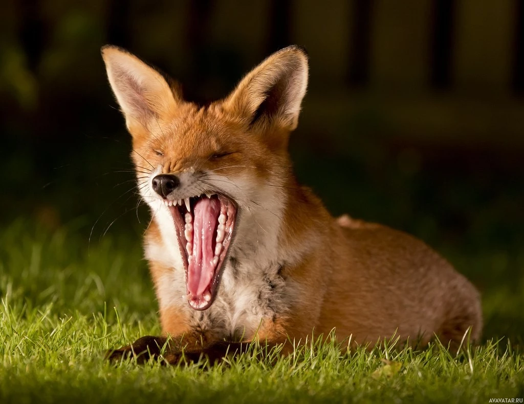 The picture shows a fox sitting on grass with its mouth wide open, appearing to be yawning or possibly growling. The fox has distinctive