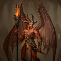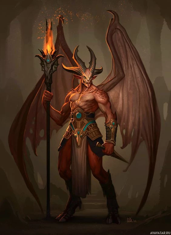 a fantasy character that appears to be a demonic entity with red wings, horns, and a tail. It is wearing armor or a costume that resembles ancient or mythical attire, including what looks like a helmet,