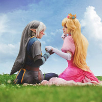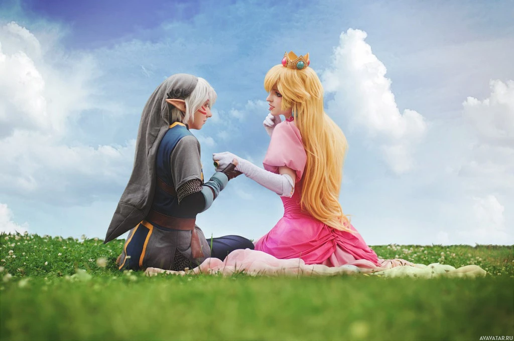 the video game series "The Legend of Zelda" and Princess Peach from the Mario franchise. They are sitting on a grassy field with a clear