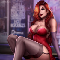 an animated character of a red-haired woman dressed in what appears to be a burlesque or cabaret outfit, complete with a corset and thigh high stockings. She is seated on a stool with her legs crossed, wearing