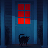 a house at night with the door open. A cat is sitting on the porch, looking inside the house with its eyes glowing red. The setting gives off a somewhat eerie and mysterious vibe due to the darkness and the illuminated glow of the cat's eyes, which could suggest a supernatural or fantasy theme.
