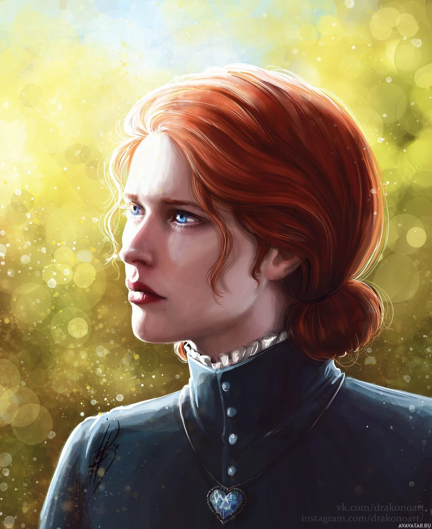 red hair styled in an elegant updo and is wearing what appears to be period-style clothing with a high collar. The background suggests a mystical or magical atmosphere, which is fitting for her character's role as