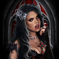 mystical atmosphere of the image. The character is depicted in a way that suggests she might be associated with the vampire mythos, which is a common theme for