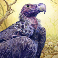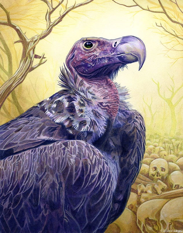 the soft lighting. In front of the vulture, there appears to be a scene with small skulls scattered across what looks like an undulating terrain, possibly representing bones or