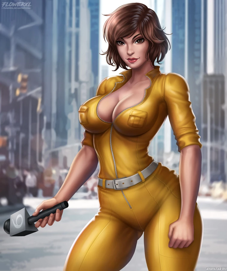 an illustrated character who appears to be a female news reporter. She is wearing a bright yellow jumpsuit and has short