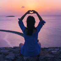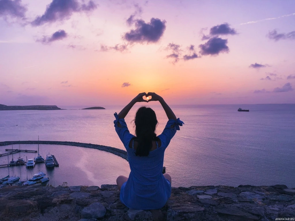 a heart shape with their hands. In the distance, there's a view of boats on the water and an orange glow from