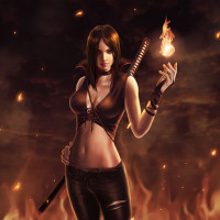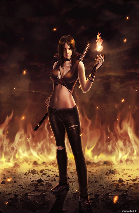 dark hair, holding what seems to be a staff or weapon with a flame at the top. Her attire is a mix of casual and fantasy elements, suggesting she might be a warrior or adventurer in her storyline. The background features fiery destruction, which adds to