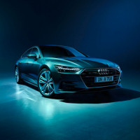 The image shows a modern car, likely an Audi based on the design and emblem. It is displayed in what appears to be a studio setting with dramatic lighting that highlights its features.