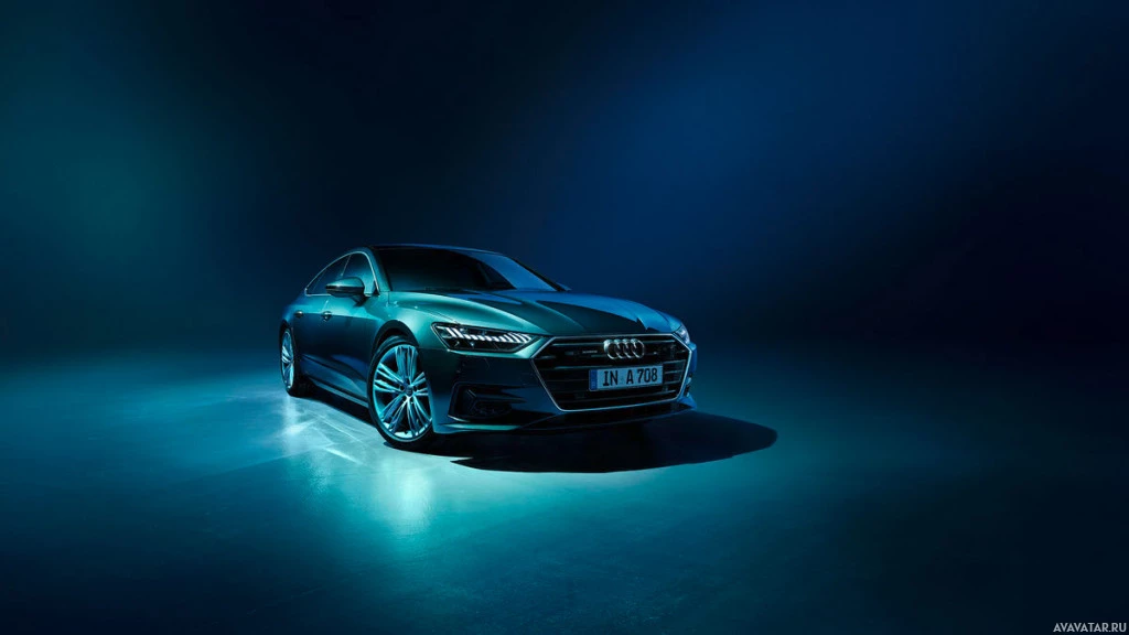 На картинке изображен современный автомобиль, скорее всего, Audi на основе дизайна и эмблемы. Он отображается в том, что кажется студийной обстановкой с драматическим освещением, которое подчеркивает его особенности.