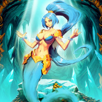 an animated character that appears to be a mermaid or sea creature with blue hair and skin, resembling a genie. She is depicted standing on what looks like treasure chest coins, suggesting she may be associated with riches or fantasy elements. The background suggests a cave-like setting, which could imply that the character is in a magical or mystical environment.