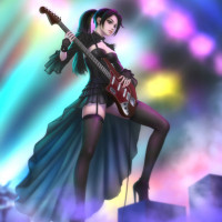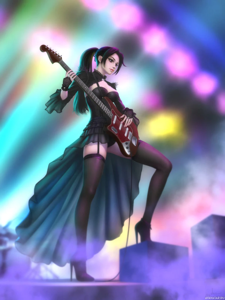 На картинке изображен анимированный персонаж, девушка-брюнетка с гитарой, выступающая на сцене. Она одета в костюм, который предполагает, что она может быть частью рок-группы или играть роль музыканта. Есть прожекторы, освещающие сцену, что добавляет динамичную и энергичную атмосферу, обычно связанную с живыми музыкальными выступлениями.