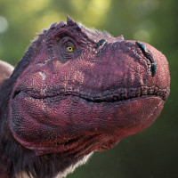 The image depicts a close-up of an animal that resembles the appearance of a dinosaur, such as Velociraptor or another similar species. The animal has a distinctive head with