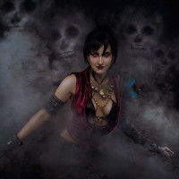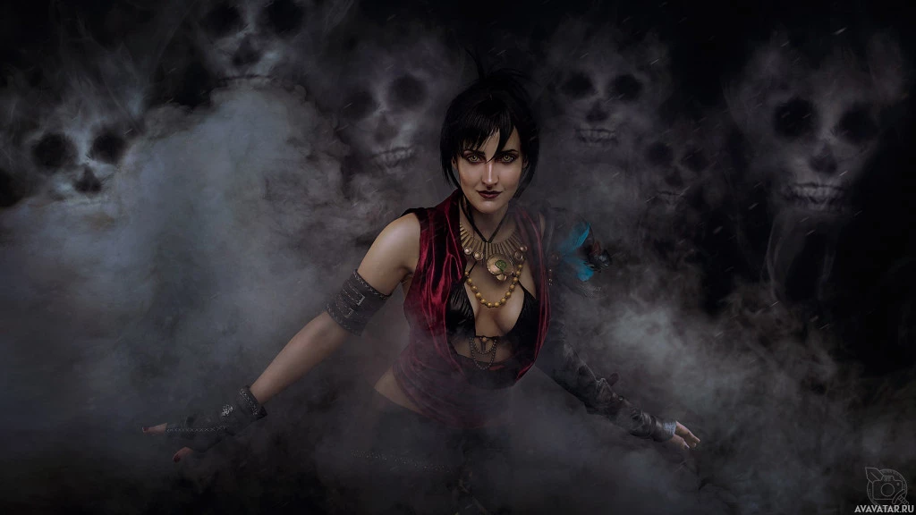 the foggy background and the skulls in the foreground. Morrigan is wearing her